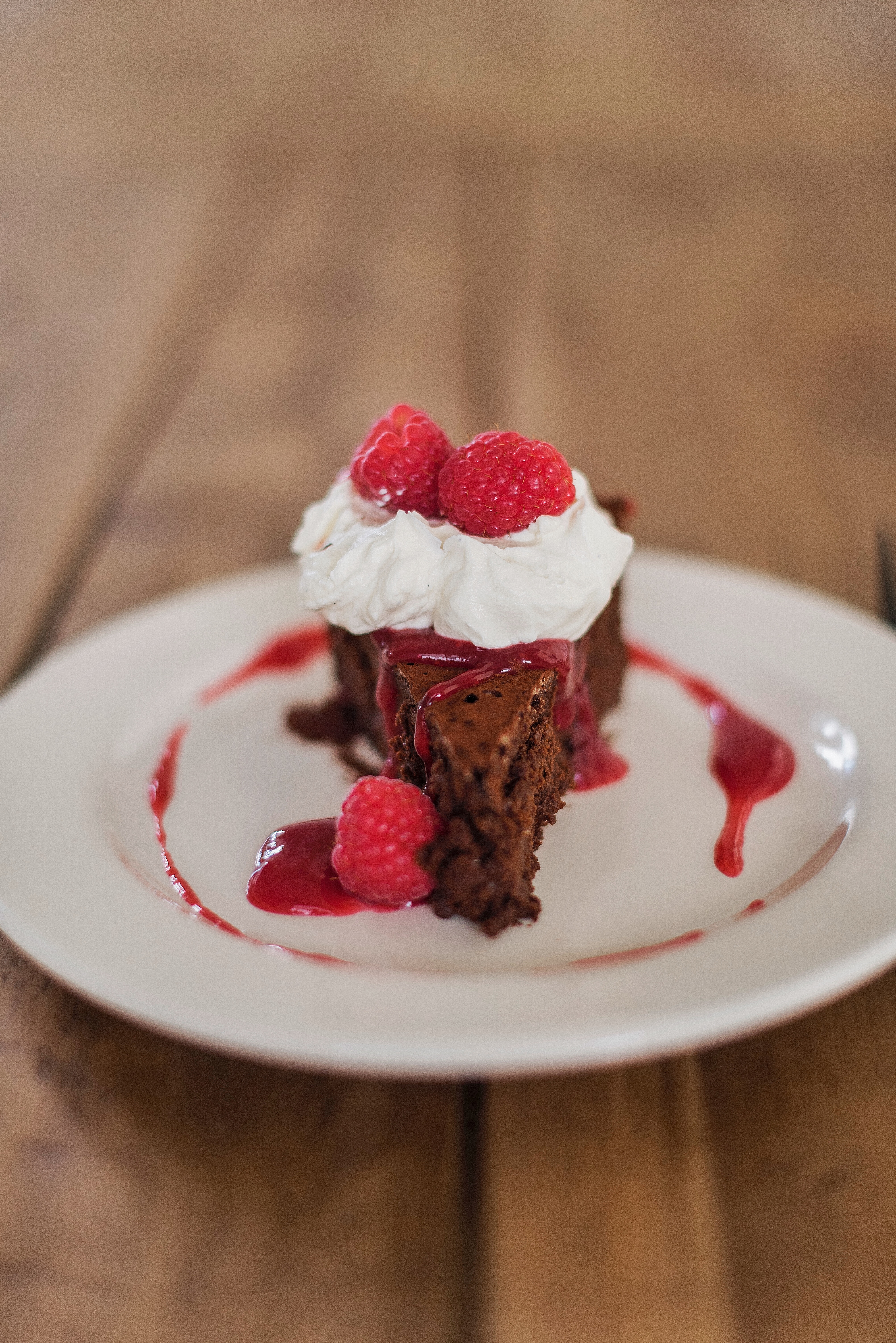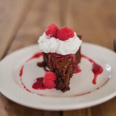 So with the bittersweet chocolate and sweet raspberry sauce, I felt like the missing flavor element was something tangy. Crème fraîche is a favorite of mine. Have you used it before? It’s something I learned about from Ryan’s parents. Ryan’s dad has used in it whipped cream for years. I love the tangy element it adds to a rich dessert like a chocolate pie, chocolate lava cakes, and this Flourless Chocolate Cake.