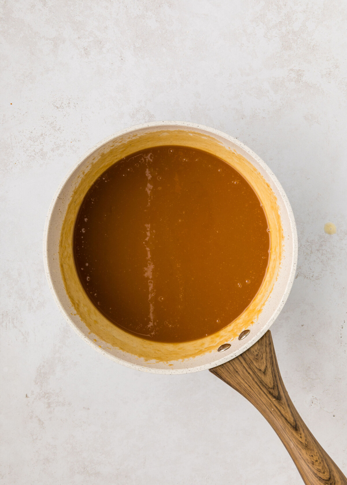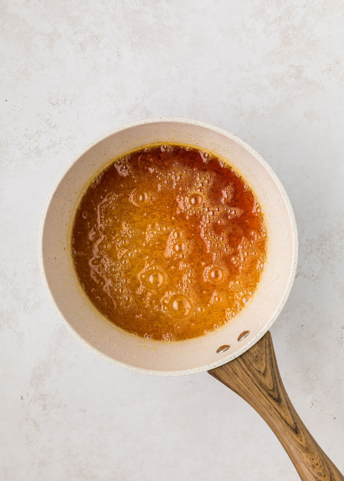 - Allow the mixture to cook until it turns a caramel/amber/light brown color.