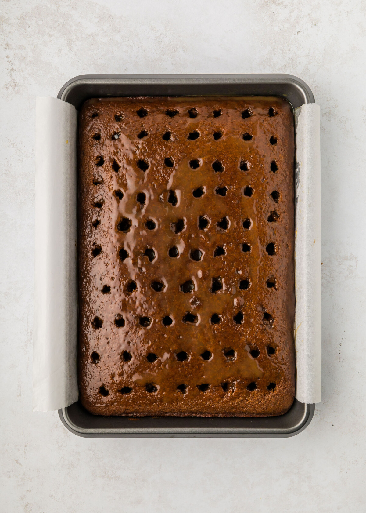 Once the cake is cooled to room temperature, poke holes all over it and cover it with the caramel.