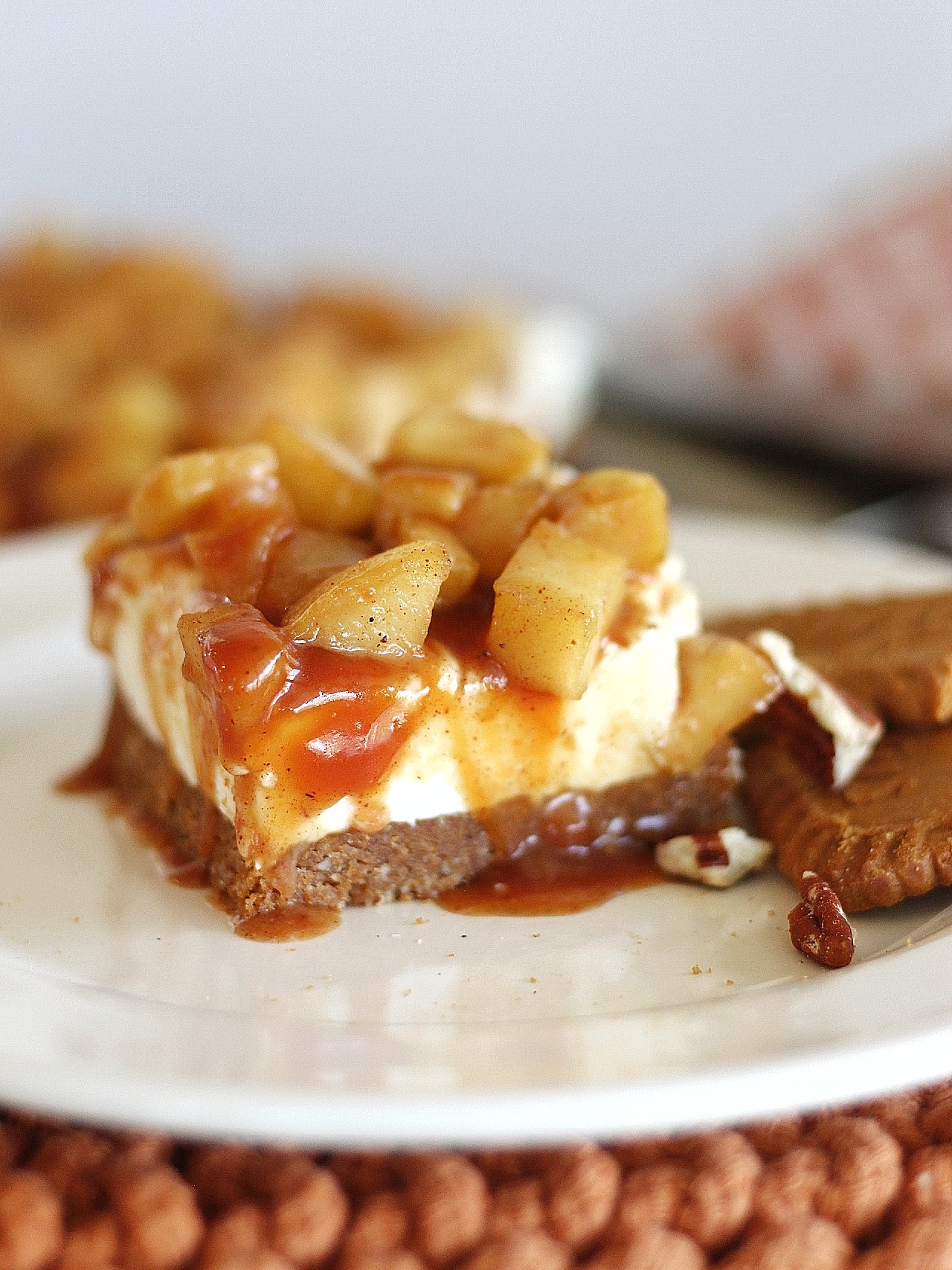 These beauties are made up of a Biscoff cookie and pecan crust, cheesecake filling, apple pie topping and homemade salted caramel.