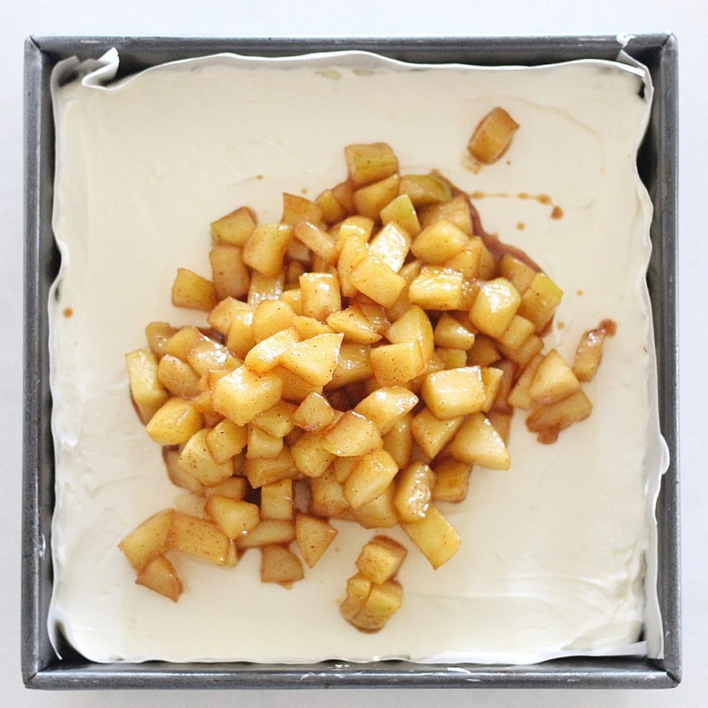 - Drain the extra juices and refrigerate the apples to cool. Once cooled, spread over the cheesecake layer of the bars.