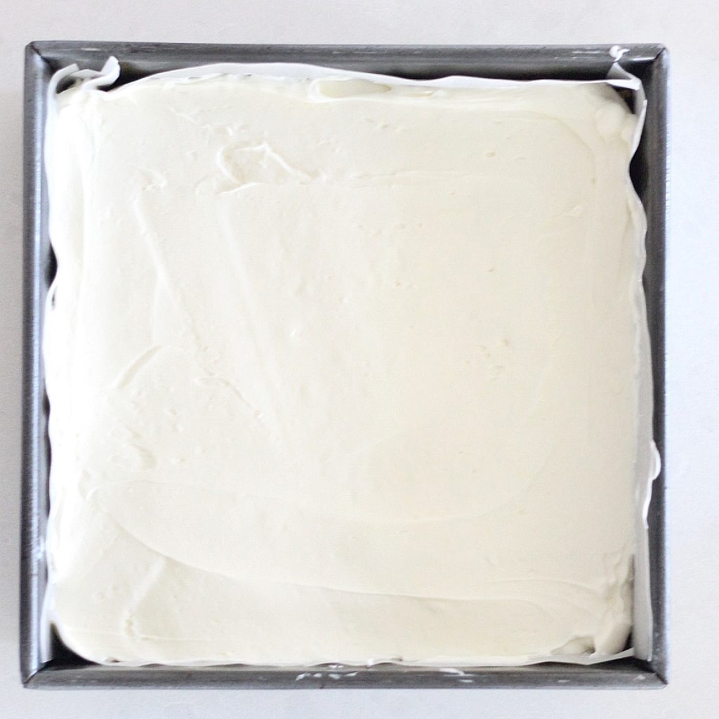 - Line an 8" x 8" baking dish with parchment paper, making sure the parchment paper runs up the sides of the pan. Spray with nonstick spray and set aside.