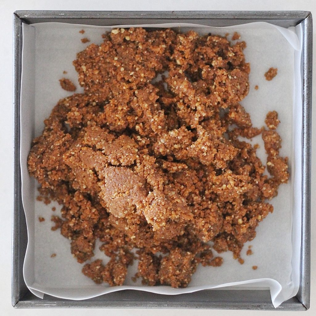 - Combine Biscoff cookies, pecans, sugar and melted butter in a food processor. Pulse for a few minutes, until the mixture resembles wet sand.