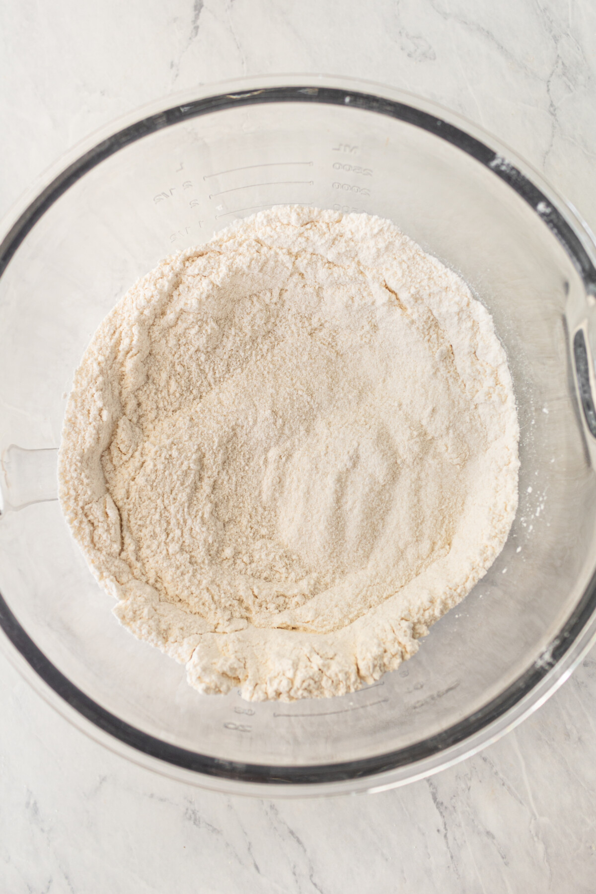 - In a large liquid measuring bowl, combine the almond milk, vanilla, oil and vinegar. Set aside.