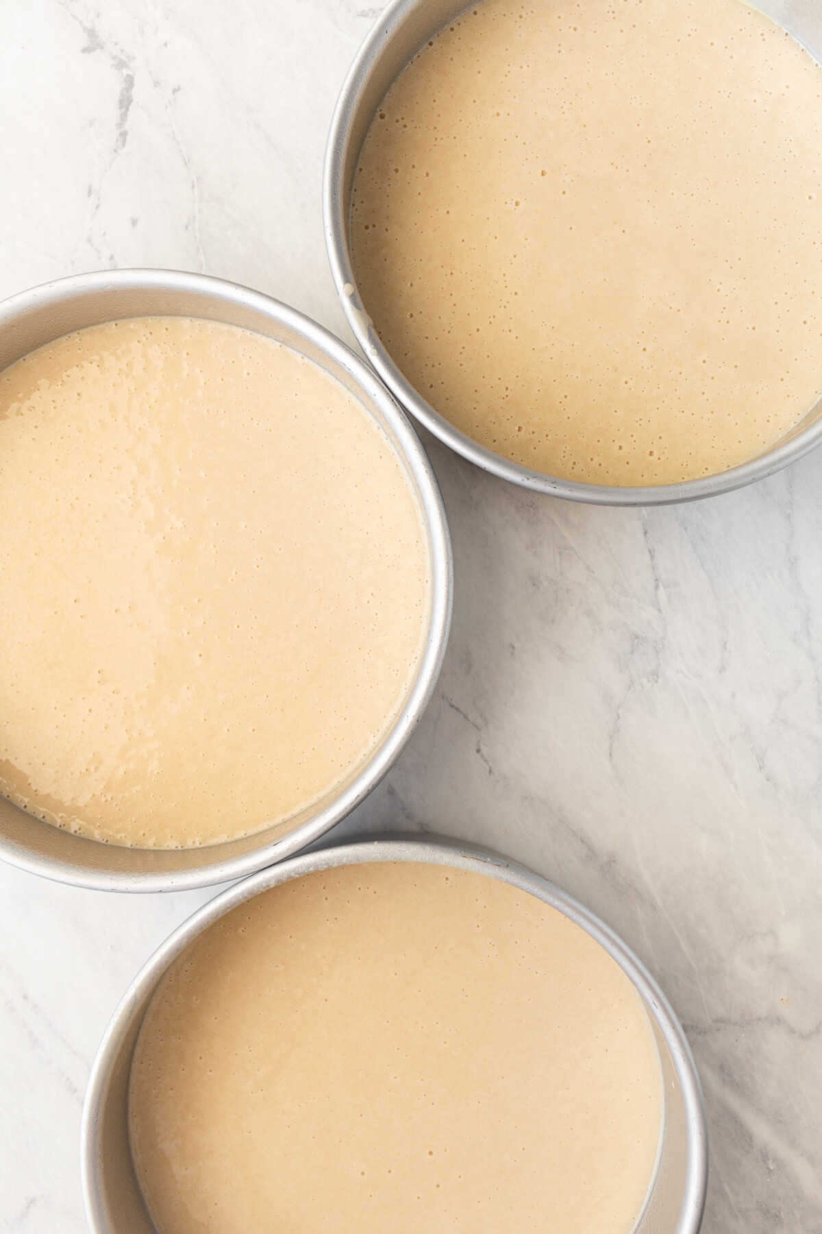 - Divide the batter evenly between the three pans (about 16 ounces of batter in each pan). Bake for 22 to 25 minutes, or until a toothpick inserted in the center of the cake comes out with just a few moist crumbs on it.Â
