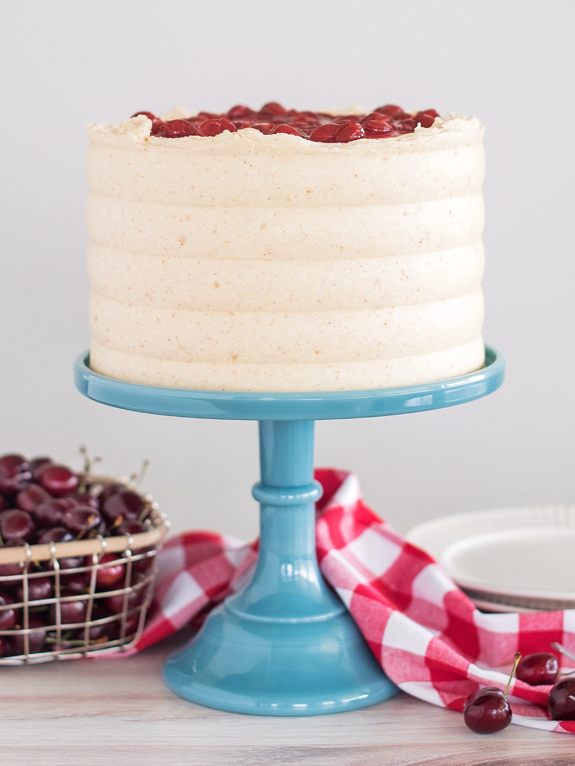 Thinking about all of these flavors and textures, I knew they’d be amazing in a cake. I kept the graham cracker crust very traditional and used it on the bottom of each cake layer. I then worked off my Blueberry Delight Cake for the cake layers and use a little cream cheese and buttermilk instead of ricotta. For the filling, I again stayed true to cherry cheese pie and did a simple combination of cream cheese, sweetened condensed milk and lemon juice. It’s also filled with homemade cherry pie filling and covered in a graham cracker buttercream.