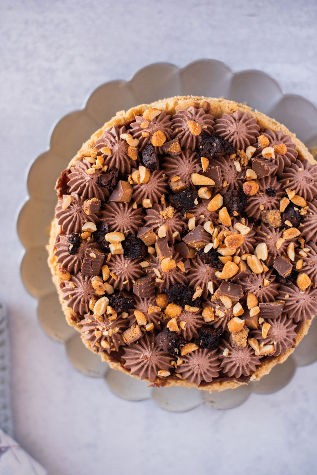 In my version, I also added a no-bake peanut butter cheesecake filling, Reese’s peanut butter cups, and topped it with chocolate whipped cream.