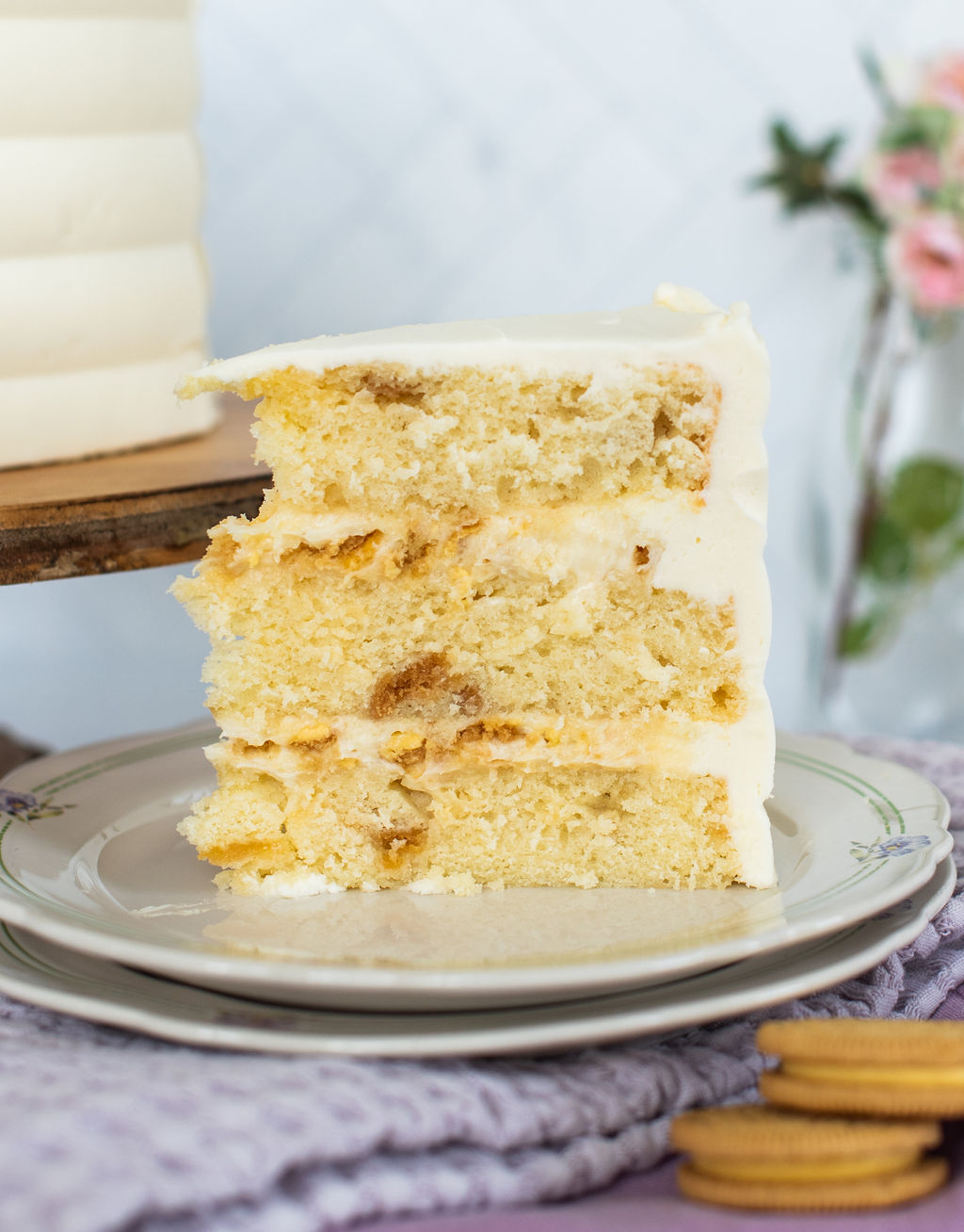 The lemon buttercream on this Lemon Oreo Cake is truly the cherry on top! This light and fluffy lemon buttercream isn’t too strong, but instead, adds just another subtle layer of the lemon flavoring to this delicious cake.